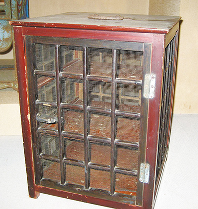 そこでハエが食べ物にくっつかないように、この蝿帳にしまいました。蝿帳はまわりに金網(かなあみ)がはられていて、ハエなどの虫は入れません。また金網のおかげで風とおしがよく、中が暑くなりすぎないようになっています。