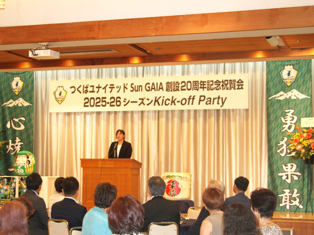 9月27日(土)、ホテルグランド東雲(つくば市小野崎)で、およそ200名もの関係者が集まり、「つくばユナイテッドSun GAIA 創設20周年記念祝賀会および2025-26シーズン Kick-off Party」が開かれた。