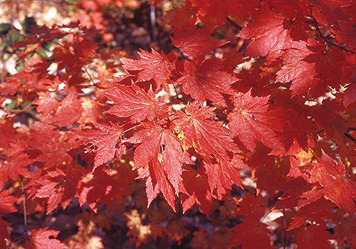 カエデの仲間は秋に紅葉する植物群ですが、30種近くが日本に自生しています。その中で、ハウチワカエデは葉も大きく、きれいに紅葉するので、日本を代表するカエデの仲間です。日本だけにある植物で、北海道から本州の低山から亜高山帯(あこうざんたい)にかけて分布しています。園芸品種も作られていて、庭園や公園などにもよく植えられています。カエデの仲間は近年の分類では、カエデ科ではなく、ムクロジ科になってしまいました。