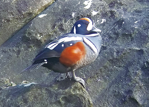 冬になると、大洗から日立、北茨城など、岩のある海岸などにやってくるカモのなかまです。オスはとてもカラフルな羽色をしているので、ほかのカモとまちがえることはありません。それにしても、どうしてこんな羽色をもつようになったのか、不思議ですね。シノリガモは、海岸の岩についている海藻(かいそう)を好んで食べますが、水にもぐって小さなカニや貝をつかまえたりもします。