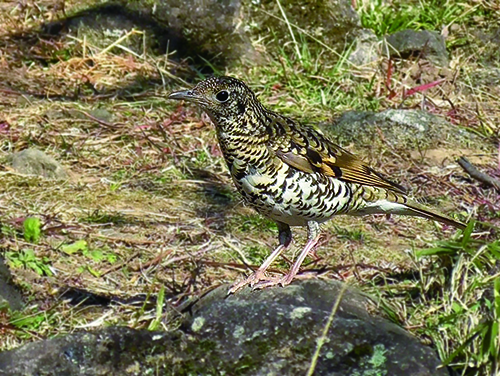 ハトより少し小さなツグミの仲間で、黄土色と黒のまだら模様がトラに似ていることからトラツグミと名付けられました。ツグミの仲間の特ちょうは、目が大きめで、足が太めであることです。それは、地面をぴょんぴょんとはね歩きながら、虫や木の実などを見つけてついばむからです。トラツグミはミミズが好物で、この写真をとったときも10センチくらいの大きなミミズを地面からひきずり出し、ひとのみしてしまいました。