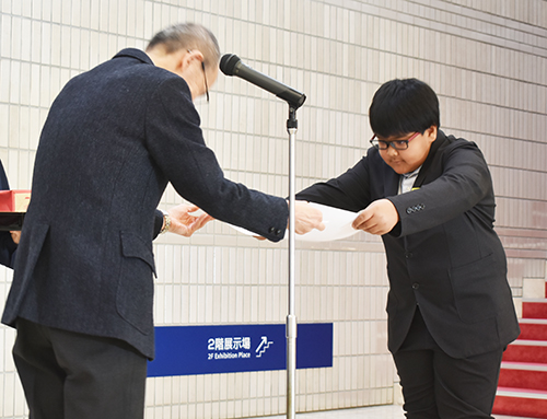 「宇宙の日」(9月12日)を記念した作文絵画コンテストの表彰(ひょうしょう)式が2月1日、つくばエキスポセンター(つくば市吾妻)であった。「月面都市」をテーマに寄せられた94点の作文絵画作品の中から小学生部門12点などが入賞。入賞者は中原徹館長から表彰状を手渡された。