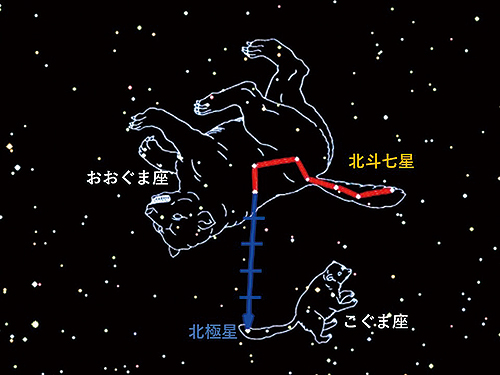 春の夜空を見上げると七つの星からなる、ひしゃくやスプーンのような形の星ならびの北斗七星(ほくとしちせい)を見つけることができます。北斗七星の先の二つの星をむすび、その線を五つ分のばしていきます。そこにある星が北極星(ほっきょくせい)です。他の星たちは時間がたつと動きますが、北極星は同じところからほとんど動きません。そして、この星が北の方角の目印となります。北斗七星はおおぐま座の一部、北極星はこぐま座の星です。このおおぐまとこぐまを親子とするお話もあります。くまの親子がいる方角を目印に春の夜空をながめてみてください。